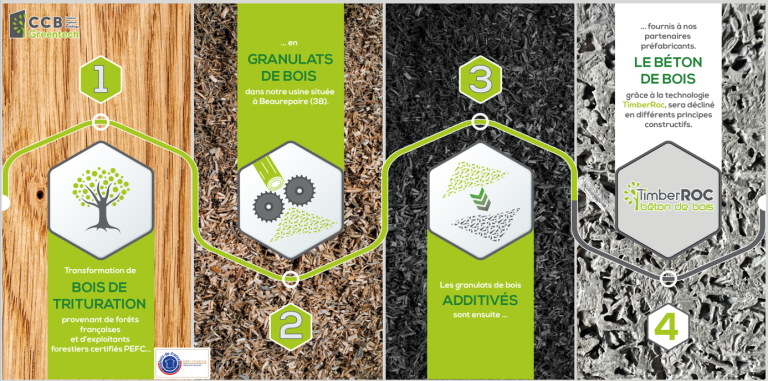 Les granulats de bois intégrés dans la matrice cimentaire proviennent de bois de trituration (co-produits de forêts) français. Raison pour laquelle ils sont labellisés Bois de France !