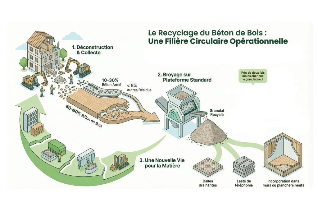 Les granulats recyclés issus du béton de bois sont aujourd’hui réintégrés dans différentes applications. Ils sont notamment utilisés dans des dalles drainantes, des éléments de lestage et, en proportion maîtrisée, dans de nouveaux éléments en béton de bois tels que des murs ou des planchers. Cette réintégration matière permet de transformer la fin de vie des bâtiments en ressource, tout en s’appuyant sur des infrastructures industrielles existantes. Elle constitue un levier concret d’économie circulaire appliquée aux matériaux de construction.