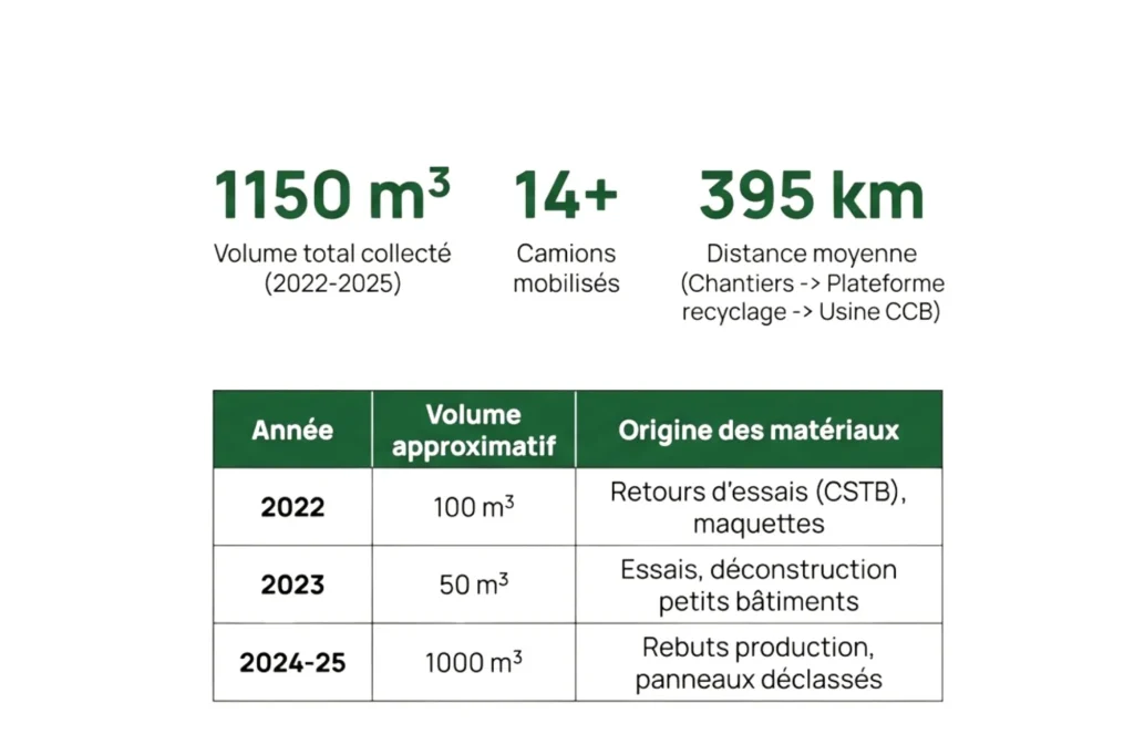 Entre 2022 et 2025, CCB Greentech a réalisé plusieurs campagnes de collecte et de recyclage portant sur des panneaux issus de retours d’essais, de rebuts de production et de bâtiments déconstruits. Plus de 1 000 m³ de béton de bois ont ainsi été collectés et recyclés dans des conditions réelles de chantier. Les granulats issus du concassage présentent une densité moyenne d’environ 550 kg/m³. Ils font l’objet de contrôles portant sur la granulométrie, la densité et la teneur en eau afin de garantir leur compatibilité avec de nouvelles applications. Ces résultats confirment la recyclabilité opérationnelle du béton de bois, y compris après vieillissement et association avec d’autres matériaux de construction.